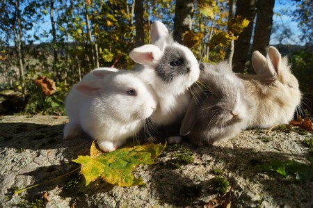 En kaninuppfödning av lejonhuvad dvärgvädur och dvärgvädur. Även olika pälstyper, satin, rex..